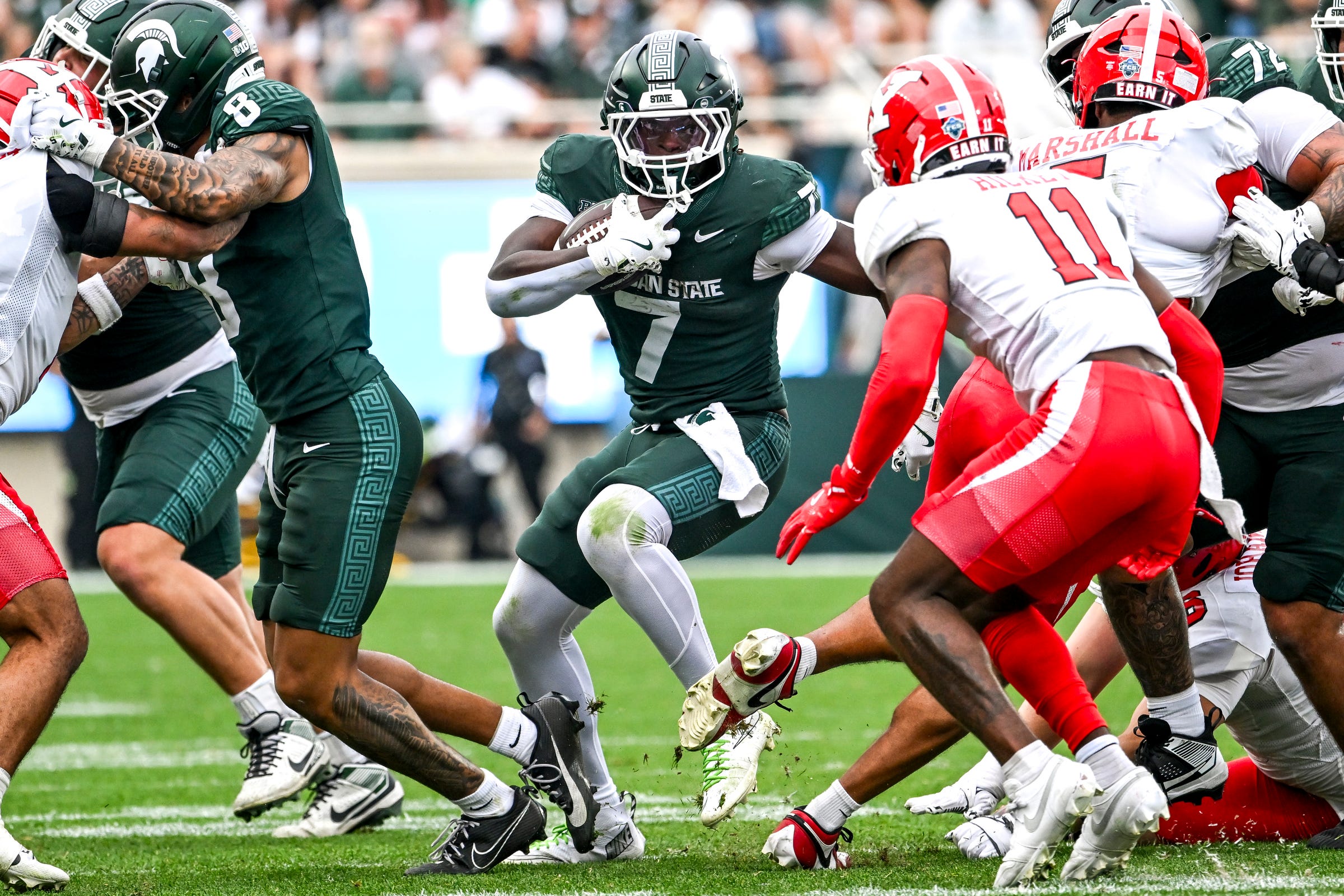 Michigan State's Brandon Tullis runs for a gain against Youngstown State on Sept. 13, 2025. Credit: Nick King/Lansing State Journal / USA TODAY NETWORK via Imagn Images
