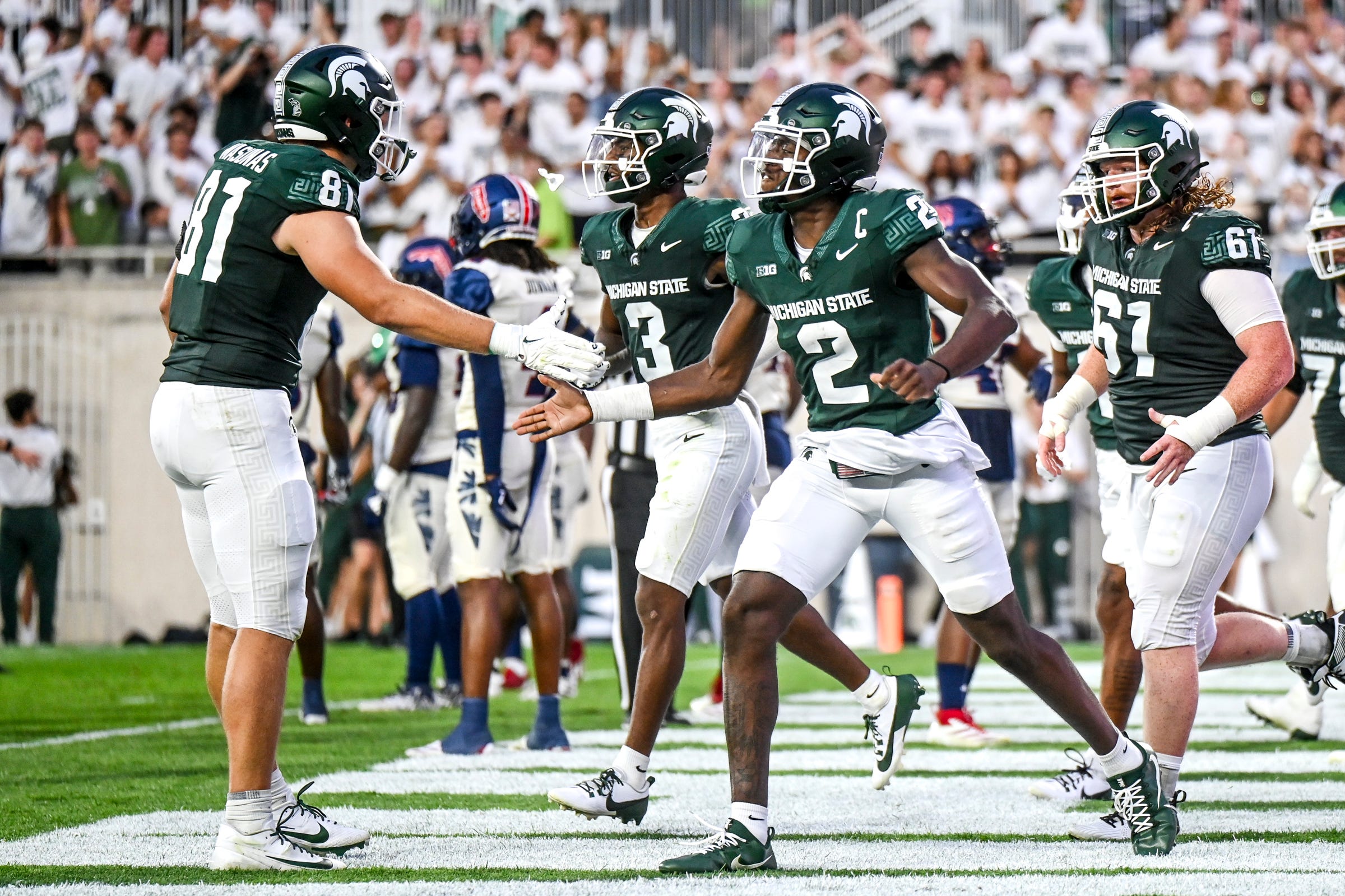 Michigan State's Aidan Chiles, right, celebrates his touchdown with Michael Masunas during the second quarter in the game against Florida Atlantic on Friday, Aug. 30, 2024, at Spartan Stadium in East Lansing.