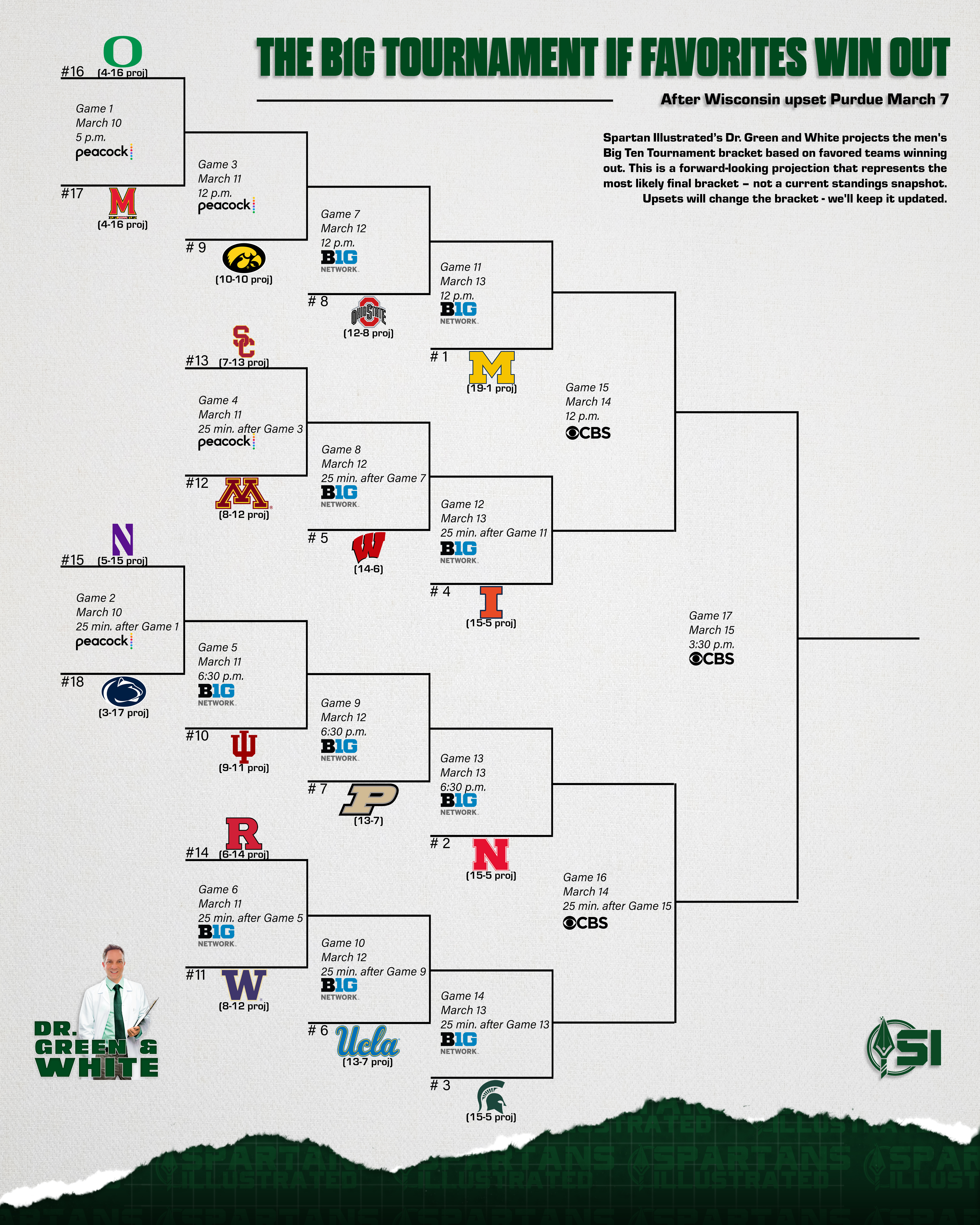Overall, there are still 128 possible ways for the regular season to play out and 49 possible unique Big Ten Tournament configurations . If the favorites win all nine remaining games, which has odds of 14.3%, the figure below shows what the bracket would look like.