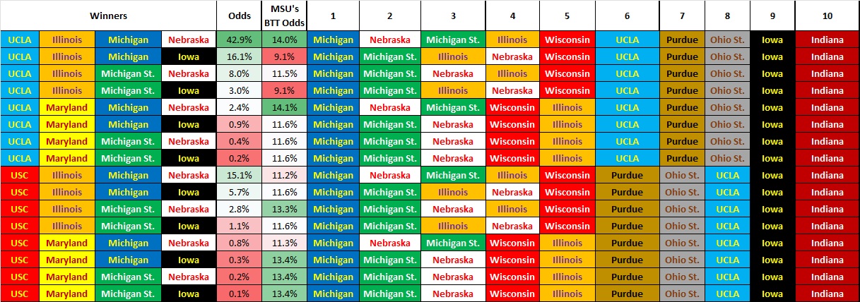 The possible first opponents for MSU from the No. 6 or No. 7 seed positions are down to Purdue, UCLA, Ohio State. Assuming there are no upsets on Thursday, UCLA is just a hair more likely than Purdue (45.3% to 44.6%) to be MSU's first opponent on Friday evening. There is also about a 10% chance that the Spartans end up on a collision course with Ohio State.