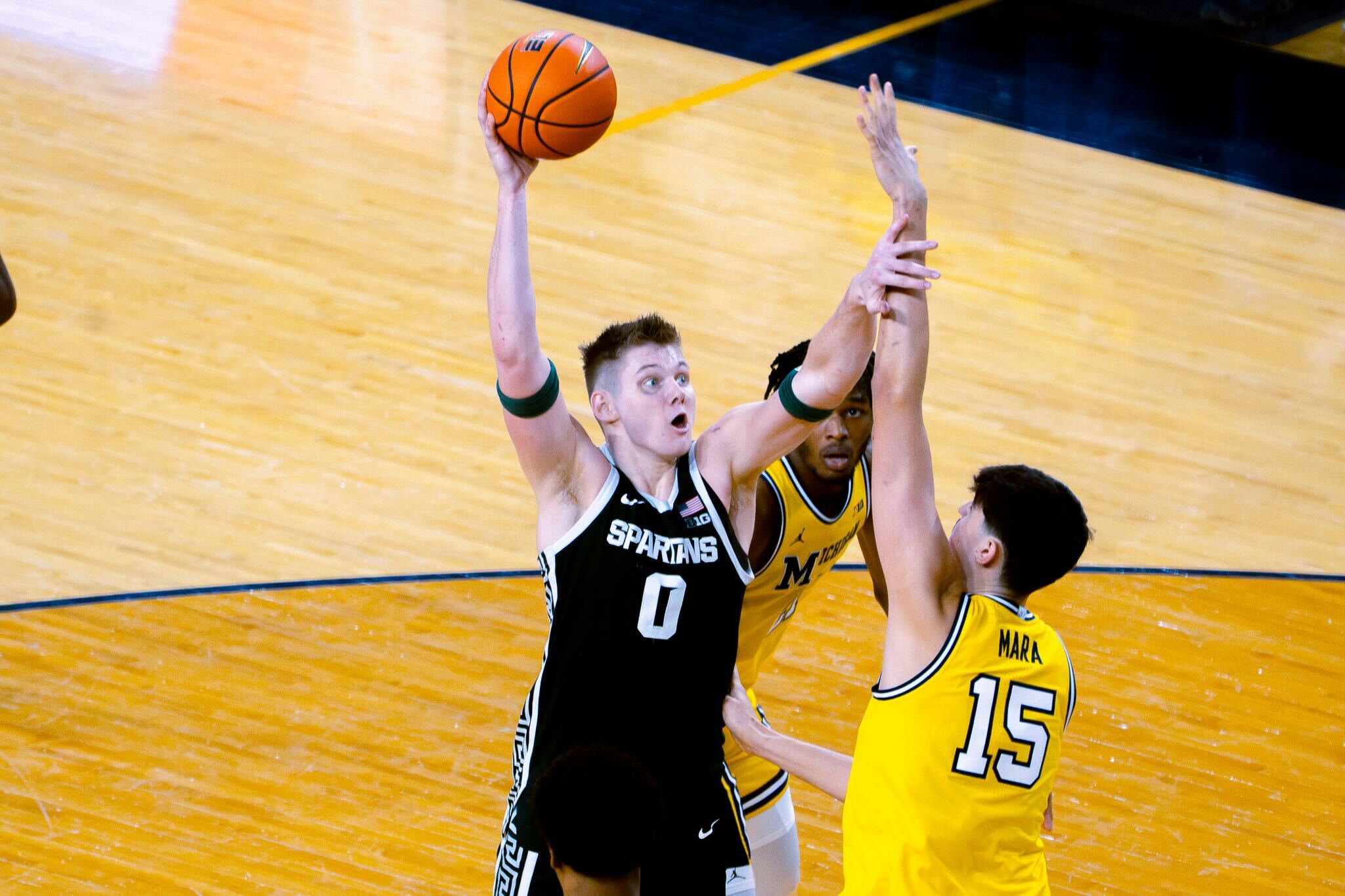 The second half started out tight for the opening stretch. The Spartans found answers for Wolverine baskets, never letting the lead grow to more than six at its largest, trailing 51-47 at the first media break with 15:39 to go. That stop in play ended up occurring for the officials to review a steal by Fears which resulted in Mara retaliating with a yank of Fears's shoulder. The officials determined it to be a flagrant one foul, what would become Mara's third and somehow final foul of the game despite physical play throughout by the Wolverine big, totaling a technical and a flagrant one.