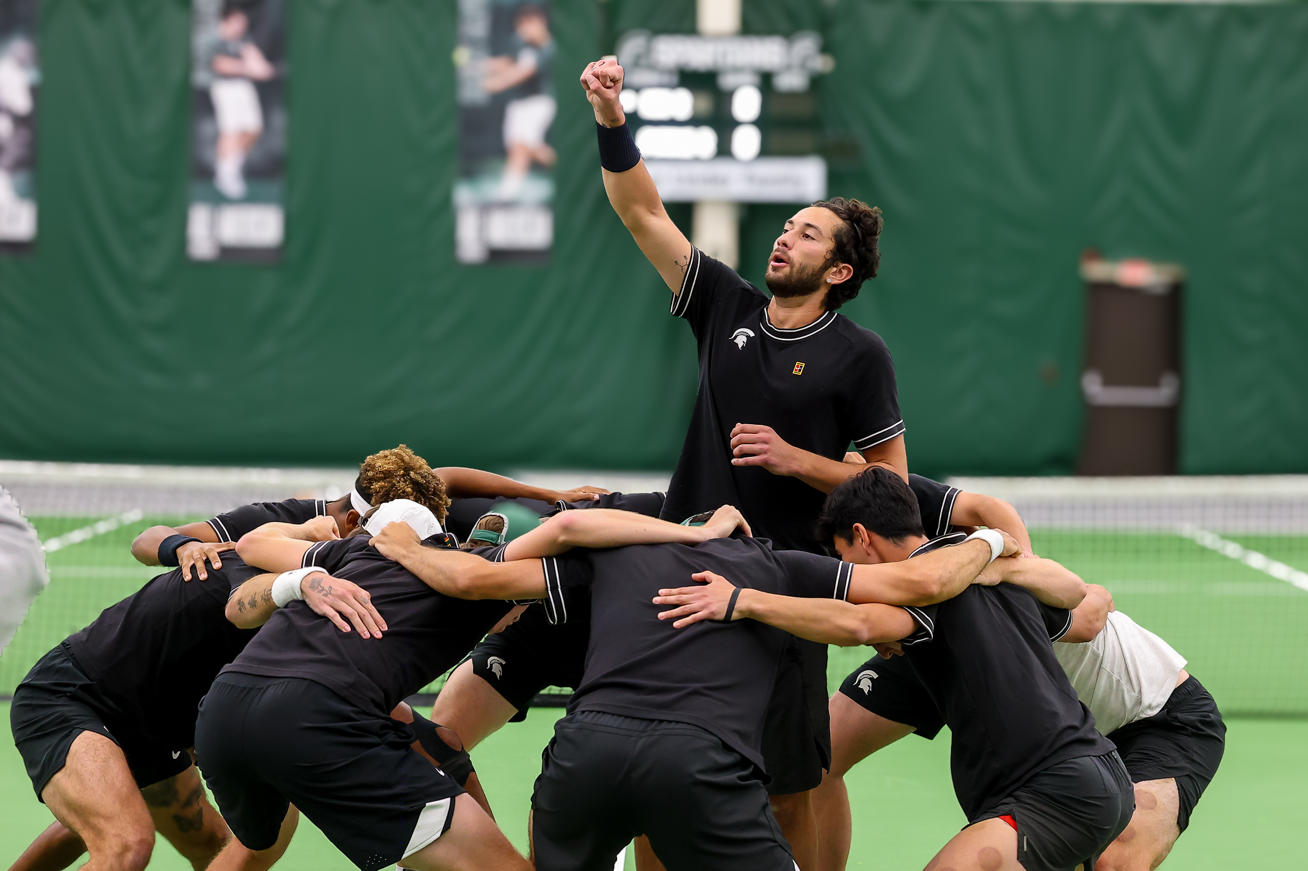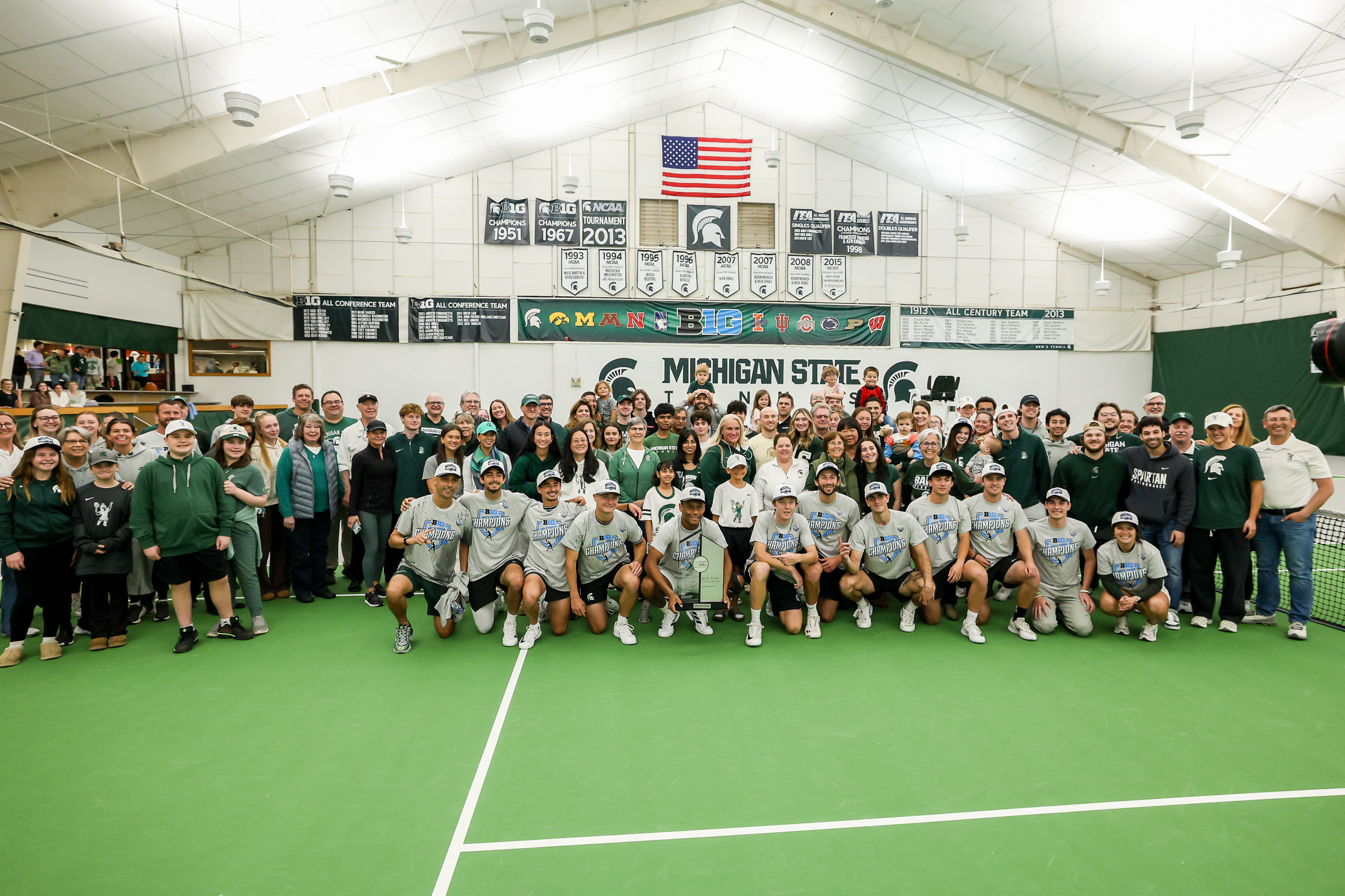 Michigan State won four straight singles matches to defeat Purdue, 4-1, at the MSU Indoor Tennis Center, clinching a share of the Big Ten regular-season championship and delivering the program’s first conference title since 1967.