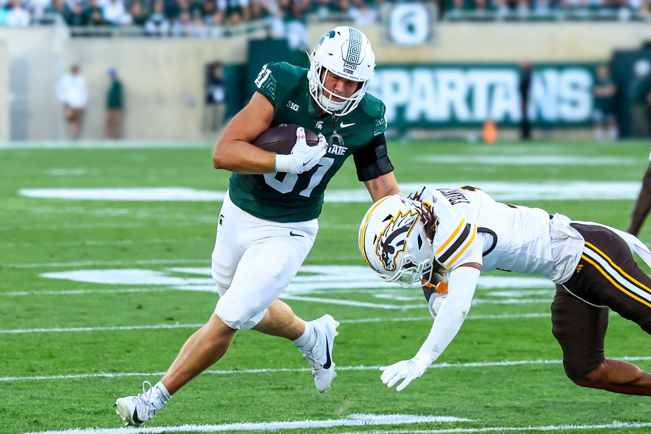 Michigan State tight end Michael Masunas evades a tackle during the first half of Michigan State's 23-6 win over Western Michigan on August 29, 2025. Photo by Marvin Hall / Spartans Illustrated