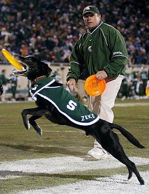 It’s that the run is still happening. The disc is still going up. And there’s still a dog chasing it down in front of a Michigan State crowd.
