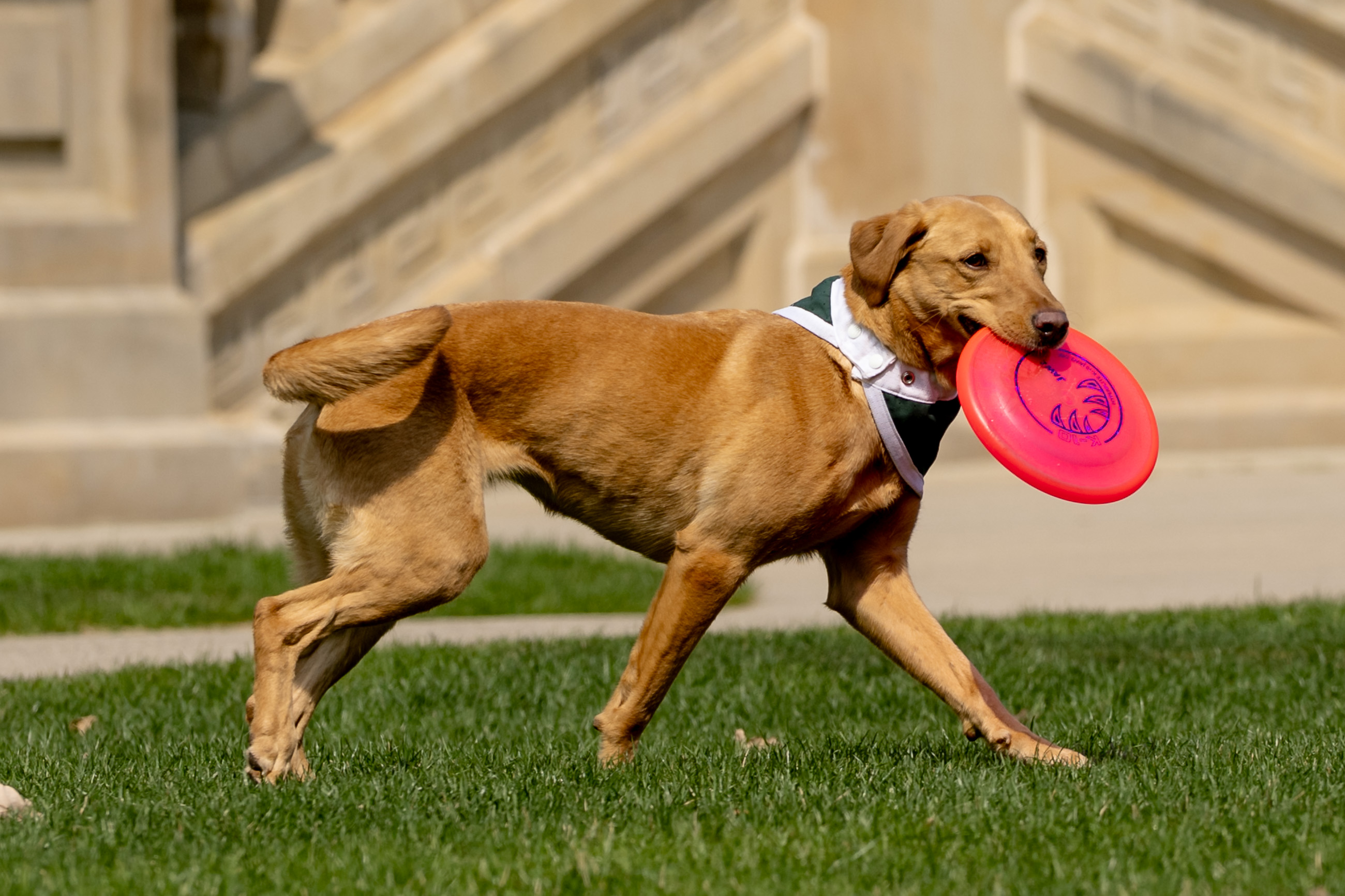 The newly crowned Zeke the Wonderdog - Zeke V aka Cindy Lou - leaps and catches a frisbee on the Capitol lawn. April 8, 2026. Photo credit: Marvin Hall/Spartans Illustrated