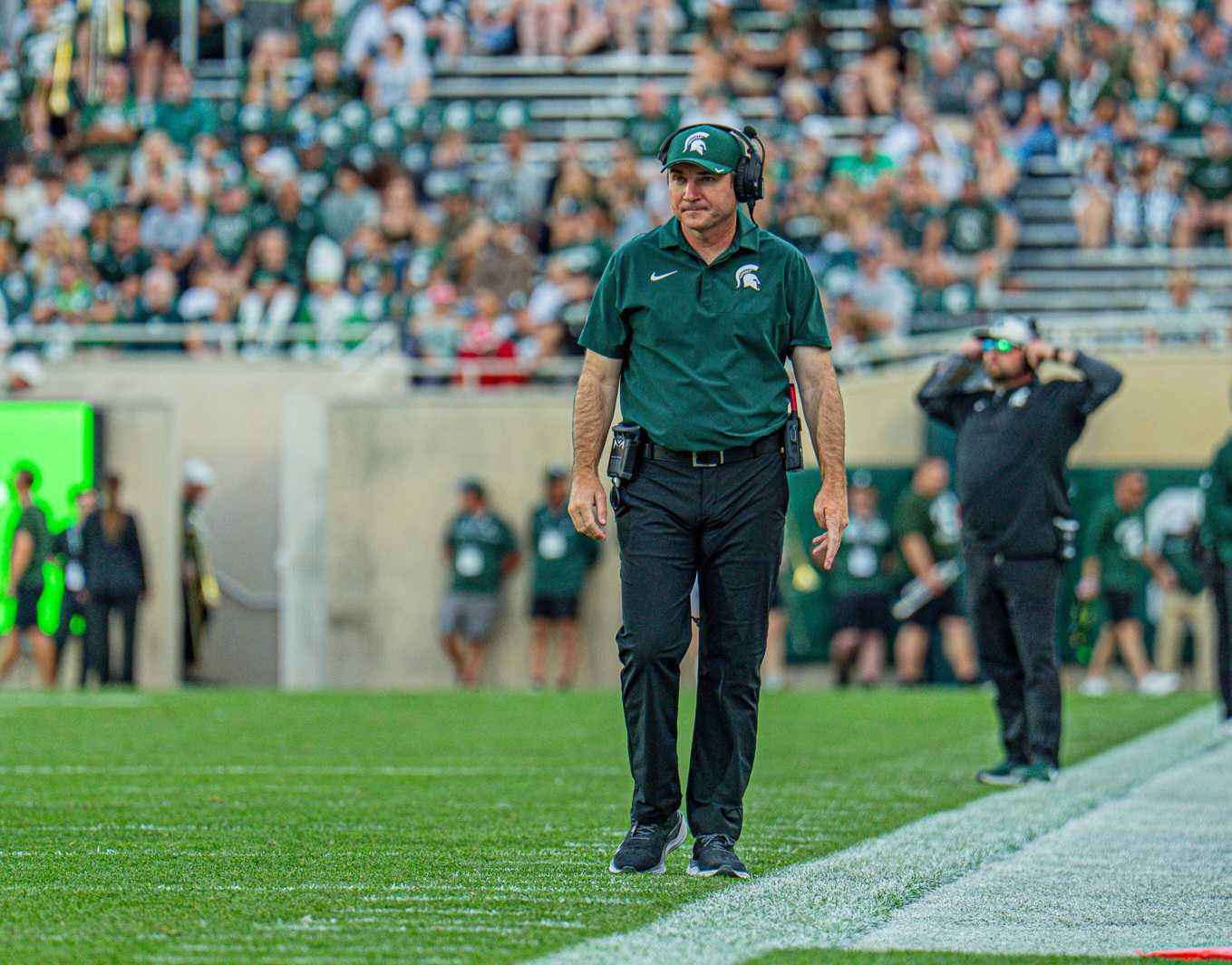 Michigan State head coach Jonathan Smith during his press conference addresses the injuries from Saturday's game against Youngstown State and how the team will travel for such a late game at USC this coming Saturday.