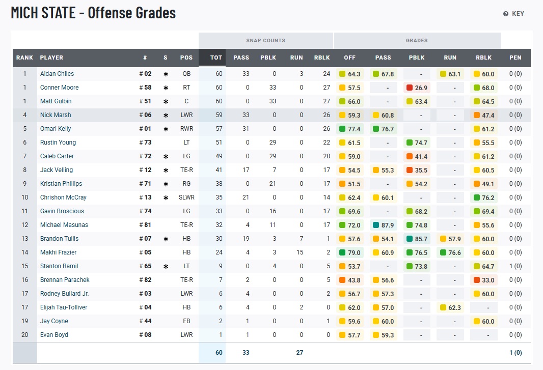 The Spartans had three offensive players who graded out over 70 this weekend:
