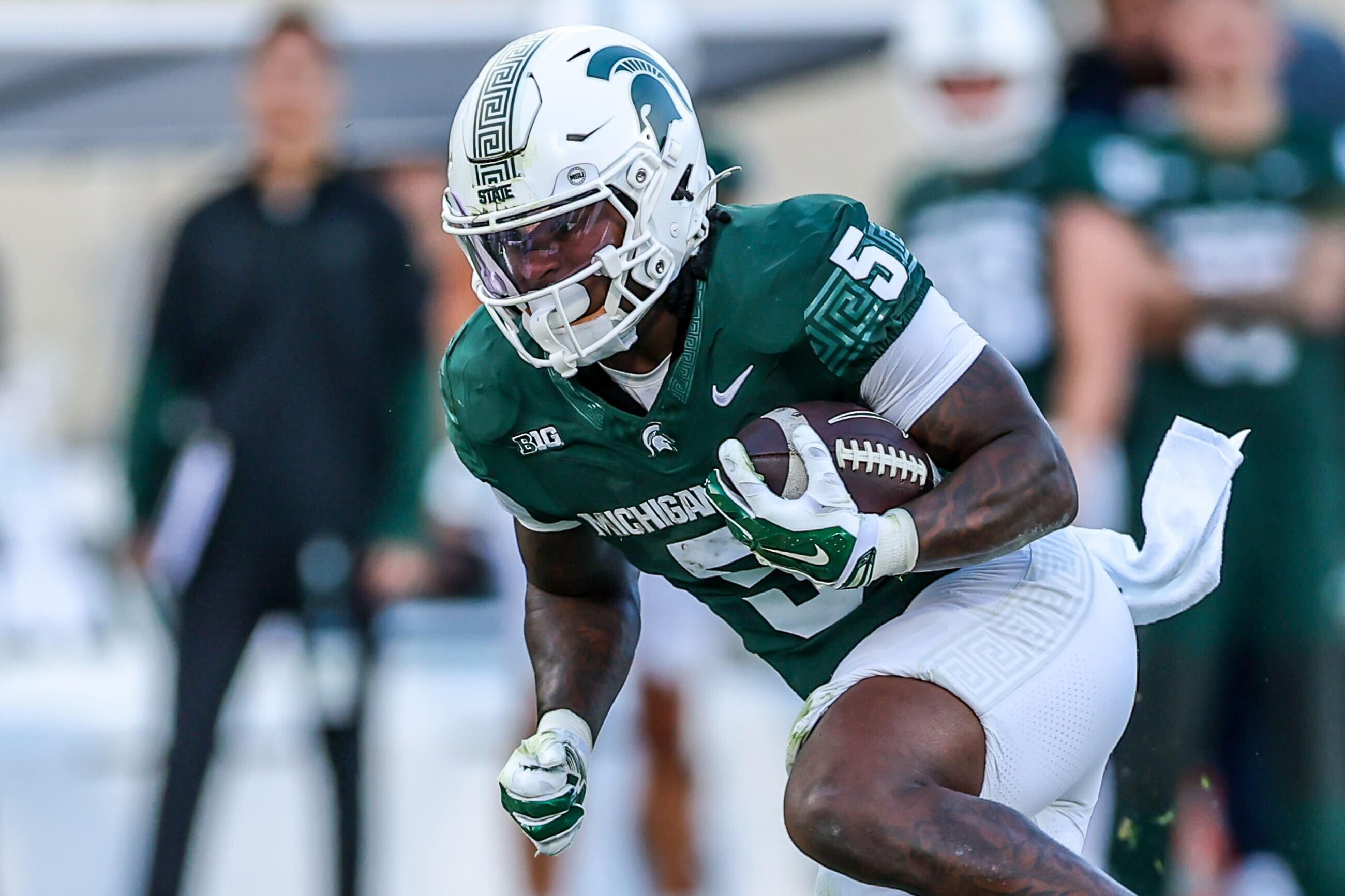 Frazier’s touchdown was set up by a 26-yard breakout run from Aidan Chiles, which tied his longest rush as a Spartan. Frazier punched it in with a 9-yard run down the middle. Frazier finished above the 100-yard mark with 14 carries for 103 yards, averaging 7.4 yards per carry.