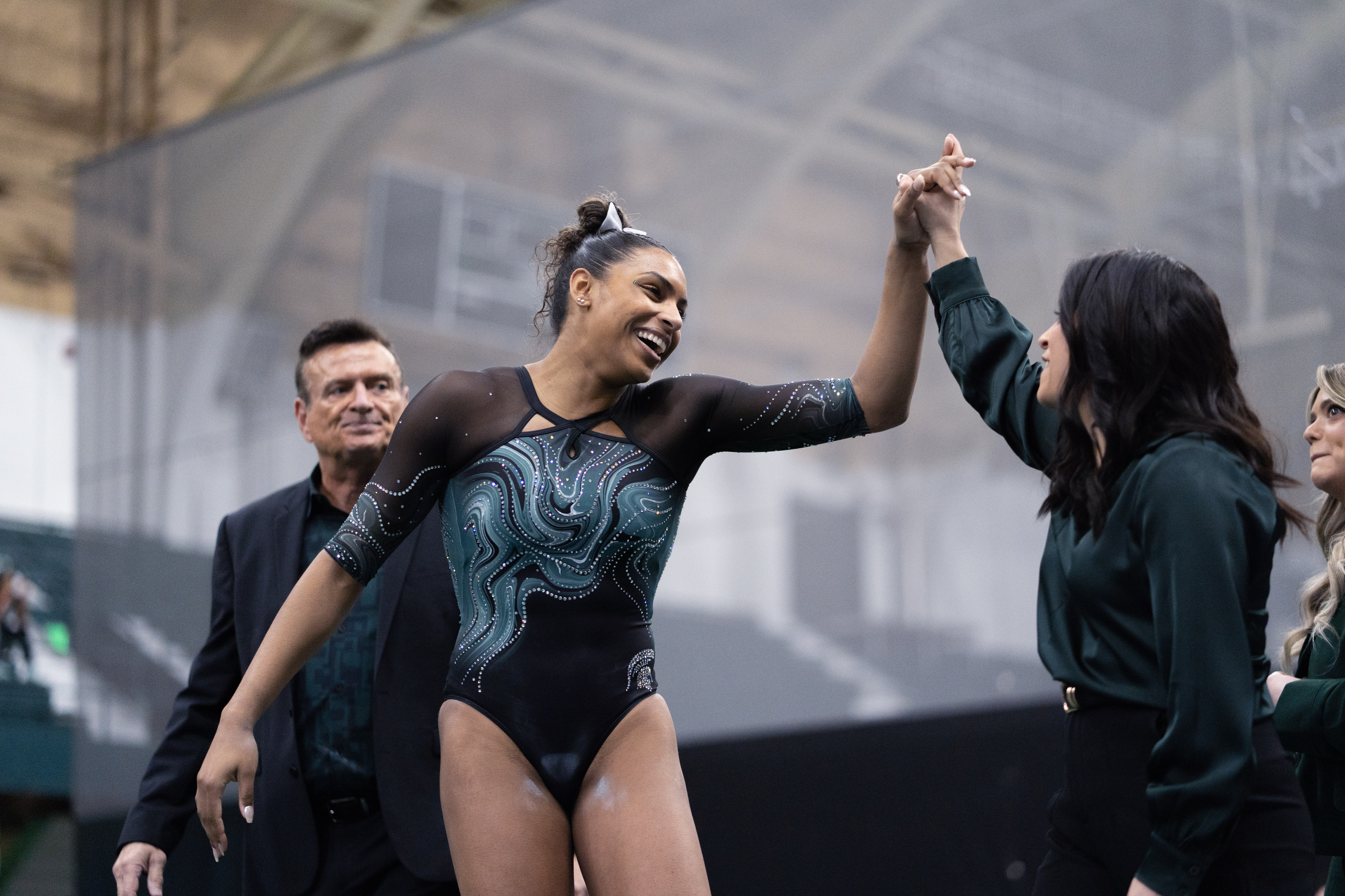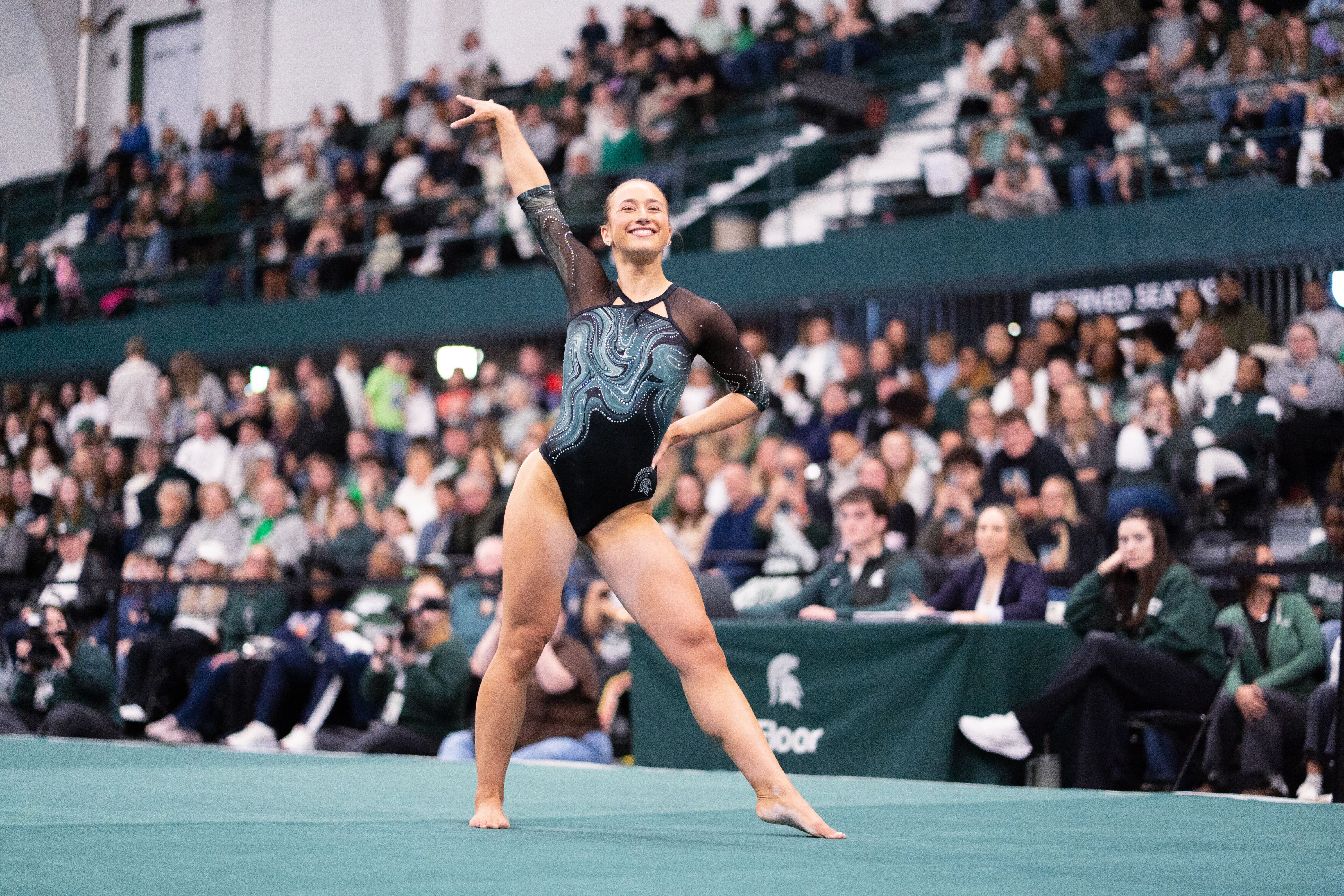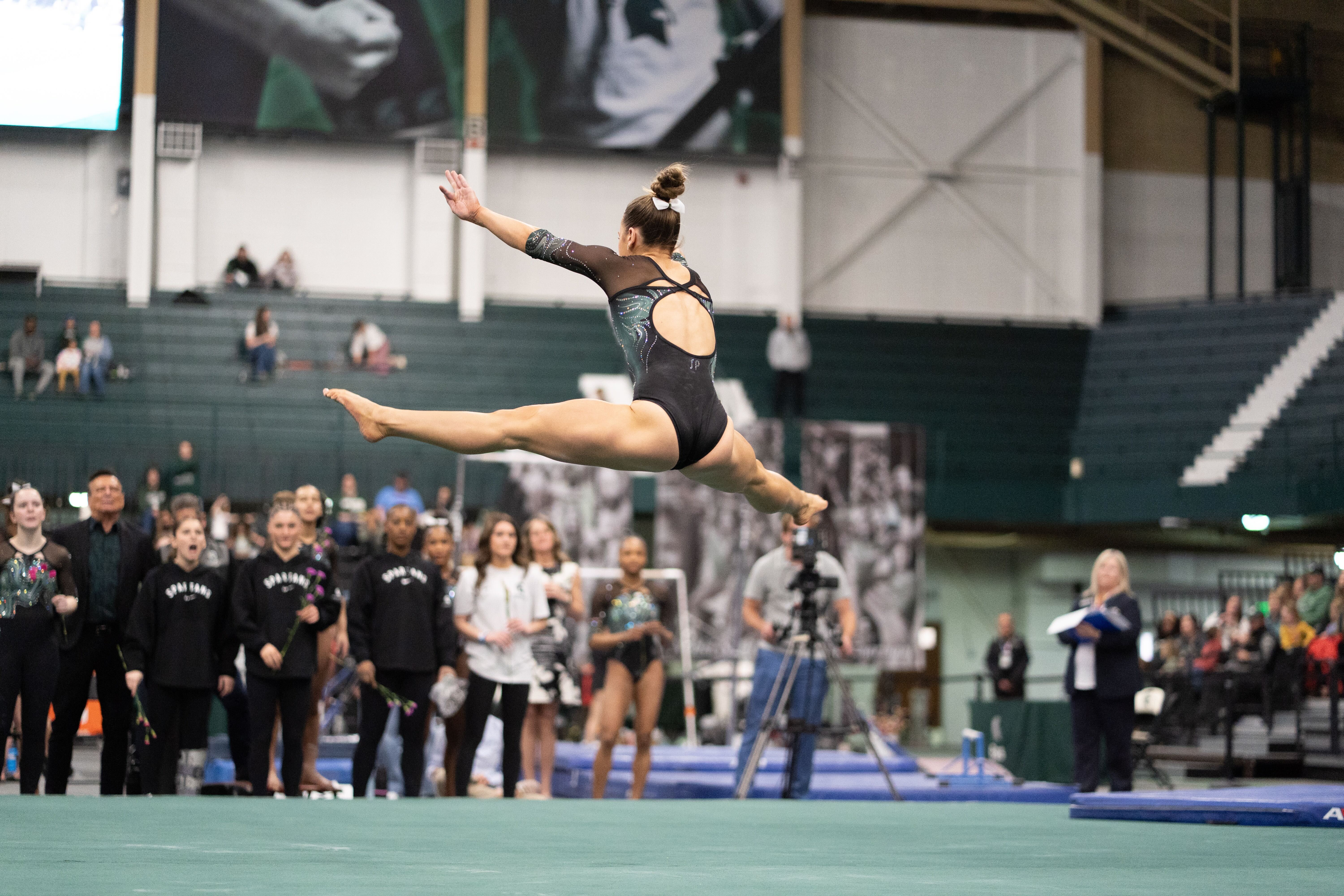 Now she’s the one opening the floor, and for her family, the moment carries even more meaning – because they believed in Michigan State gymnastics long before it looked like this.